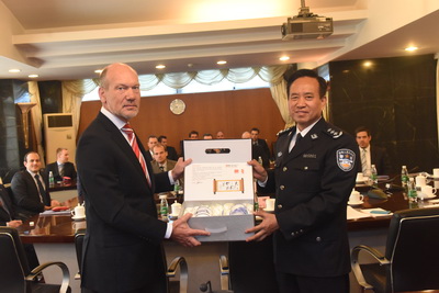 程琳校长向德国警察大学副校长提尔曼先生赠送纪念品