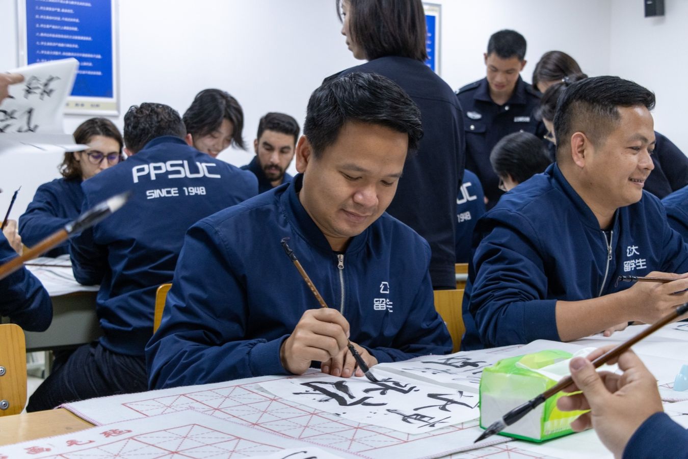 活动中,中国学生代表为留学生详细介绍了中国书法的文化背景和基本书写技巧,并结合春节贴“福”字、挂春联等民俗实例,讲述书法在中国传统文化中的重要地位,还手把手指导留学生从“横竖撇捺点”开始学起,通过实践体验书法的文化魅力。