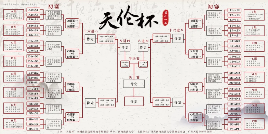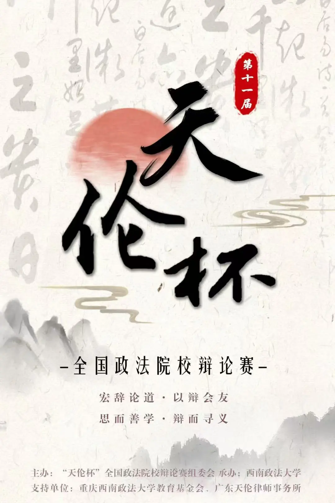 “天伦杯”全国政法院校辩论赛是由全国“天伦杯”全国政法院校辩论赛组委会主办,西南政法大学承办的高规格,大规模,高水平,高影响力的全国性辩论赛事。比赛特邀众多知名辩手、法律界学者及实务精英担任评委,并为参赛辩手提供宝贵的建议与指导,旨在通过促进全国政法院校学子的深度思辨与思想碰撞,培养造就更多具有坚定理想信念、强烈家国情怀、扎实法学根底的法治人才,推动法学教育和法学研究高质量发展。