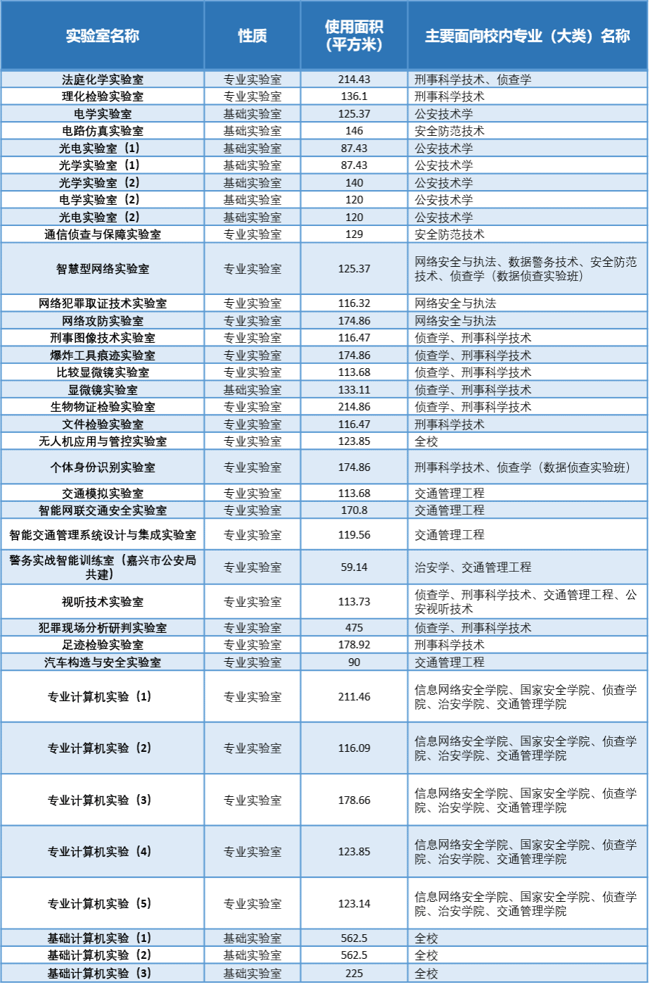 学校现有警务心理、交通管理、刑事科学技术、信息网络安全、专业计算机等5个本科教学实验室。设有通信侦查与保障、网络攻防技术、视听技术、法庭化学、生物物证检验、犯罪现场分析研判、智能网联交通安全等基础、专业教学实验室。实验室拥有设备6287台件,总值8504.48万元。其中,贵重仪器设备(单价大于10万元)40台件,价值1412.77万元。每学年实验室共开设75门实验课,225个实验教学项目,其中综合性设计性实验项目(两性实验项目)111个,承担本科实验教学14余万人时数。主要教学实验室情况如下表所示: